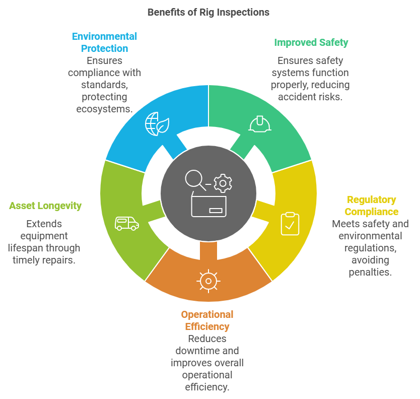 Inspections ensure that the rig’s operations comply with environmental protection regulations, particularly in offshore operations. This includes evaluating waste management systems, spill prevention measures, and emissions control systems.
